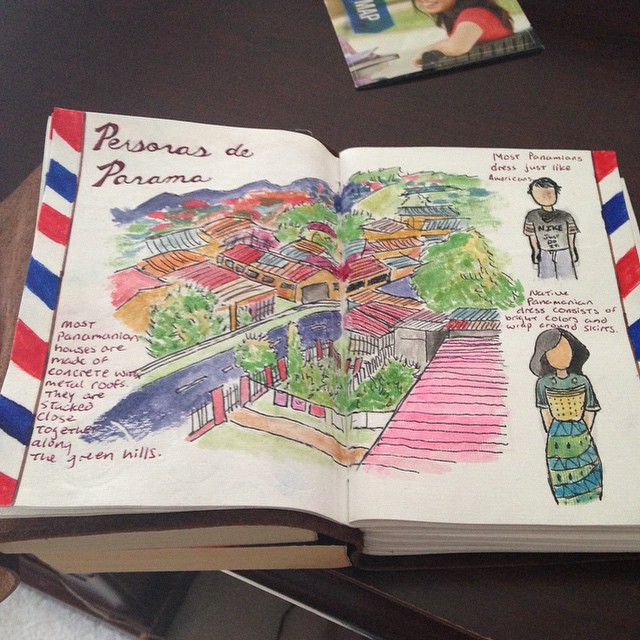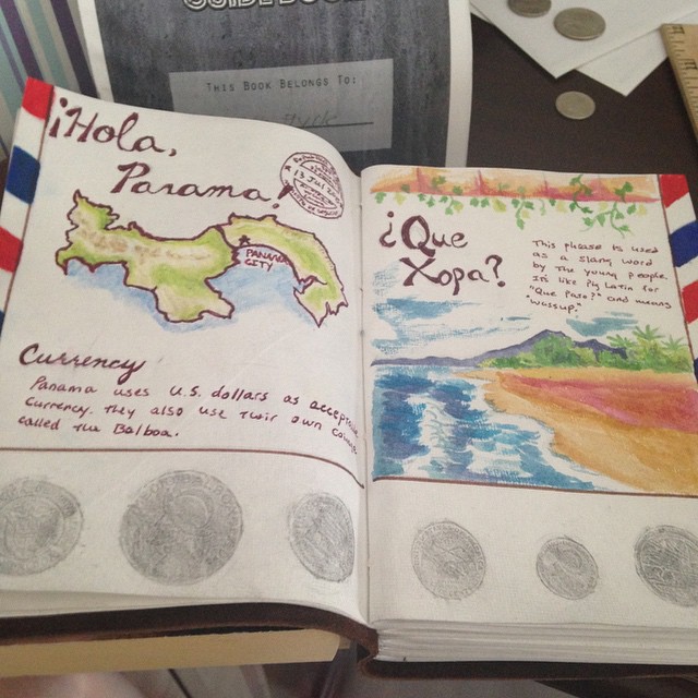 After the Panama missions trip, I wanted to dedicate a couple pages to the country in an art journal. I added a map of the country, a slang phrase teenagers use to say “whazzup,” some rubbings of Panamanian currency, artwork from photos I took, and write-ups on clothing worn.