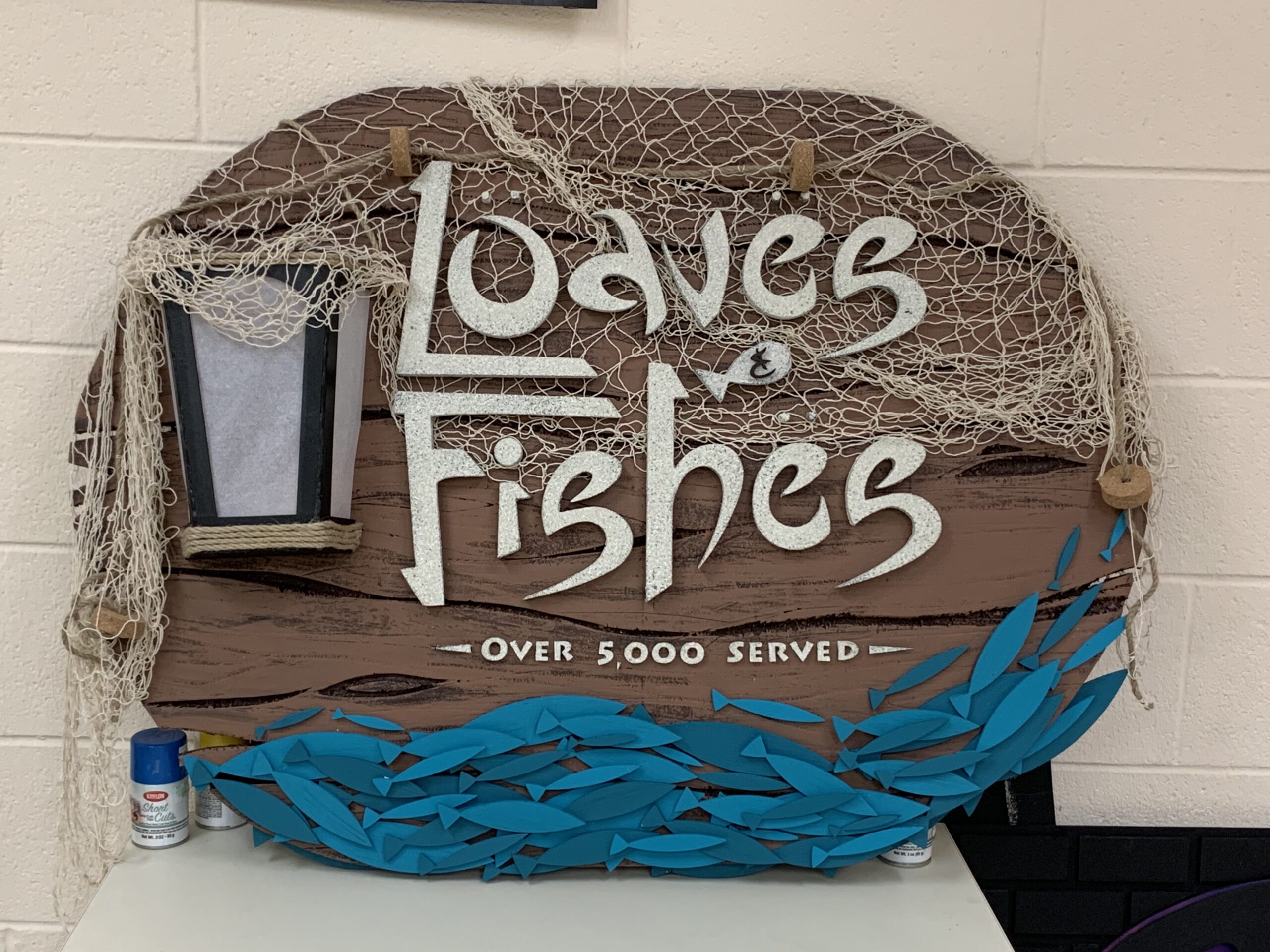 The fish and paint colors were inspired by The Chosen‘s title screen graphics and made with laser-cut foam board, and the lantern is a combination of foam board, tracing paper, twine, and a battery-powered candle.