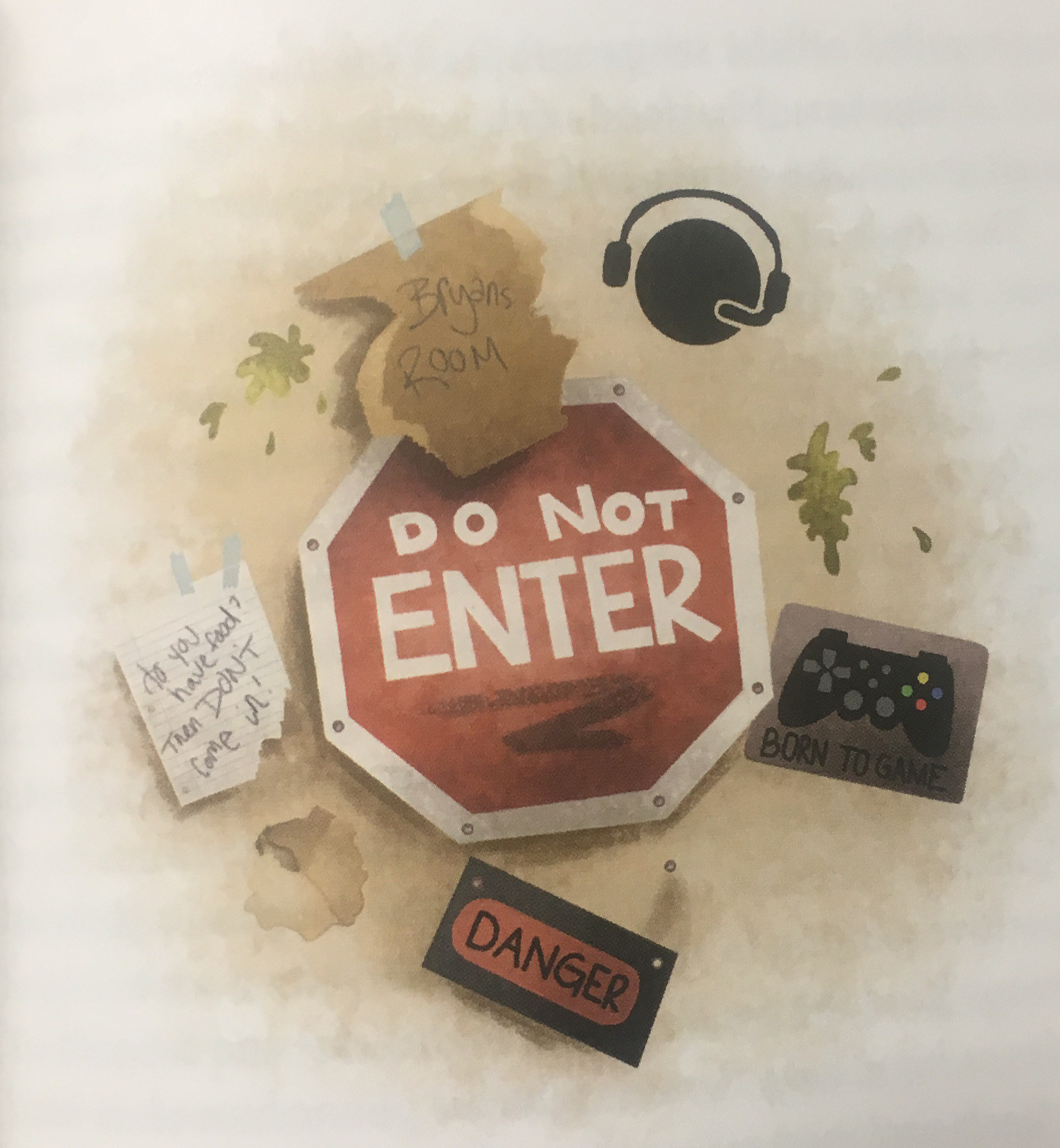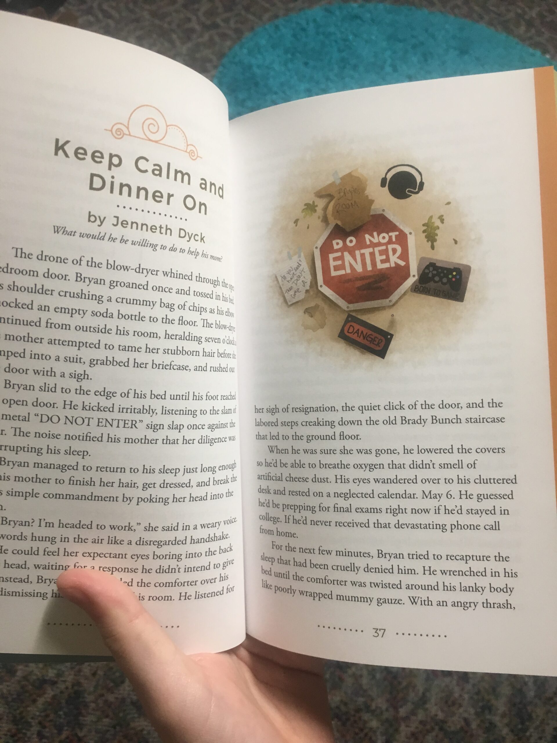 The extra funny thing is, Bryan Sign comes from my working novel (you can read an excerpt here) and has similar hobbies and interests as the Bryan Sign in this story. The character in my book, however, goes by the nickname “Stop Sign” because of his bright red hair. Nowhere in the short story does his nickname get used, but the illustrators still somehow came up with the idea of illustrating a stop sign on his bedroom door, even though no one in those classes know the significance.